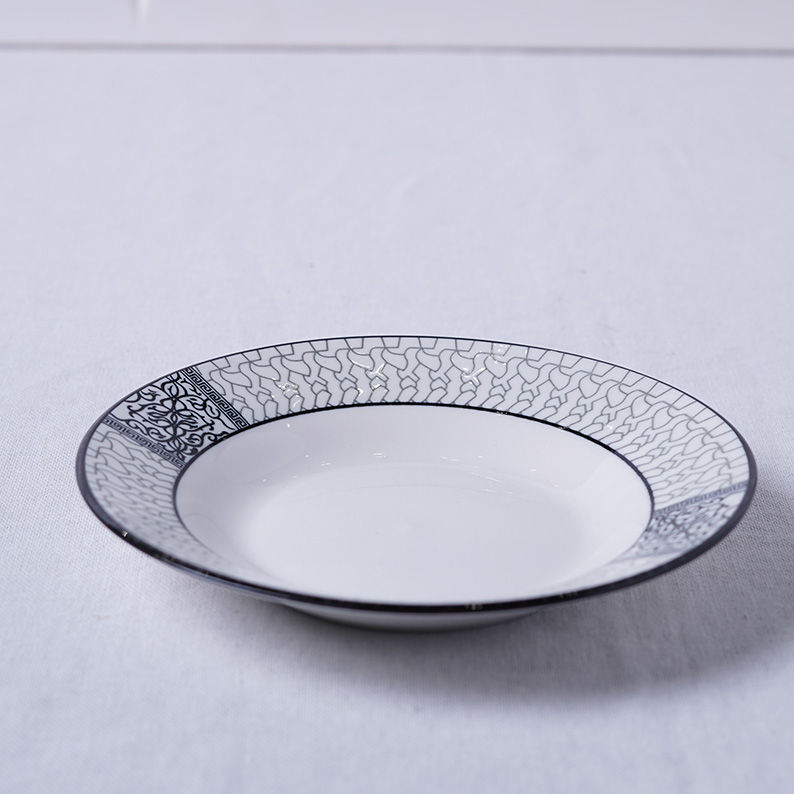 Assiette creuse en faïence ou porcelaine blanche avec un décor sophistiqué et contrasté.