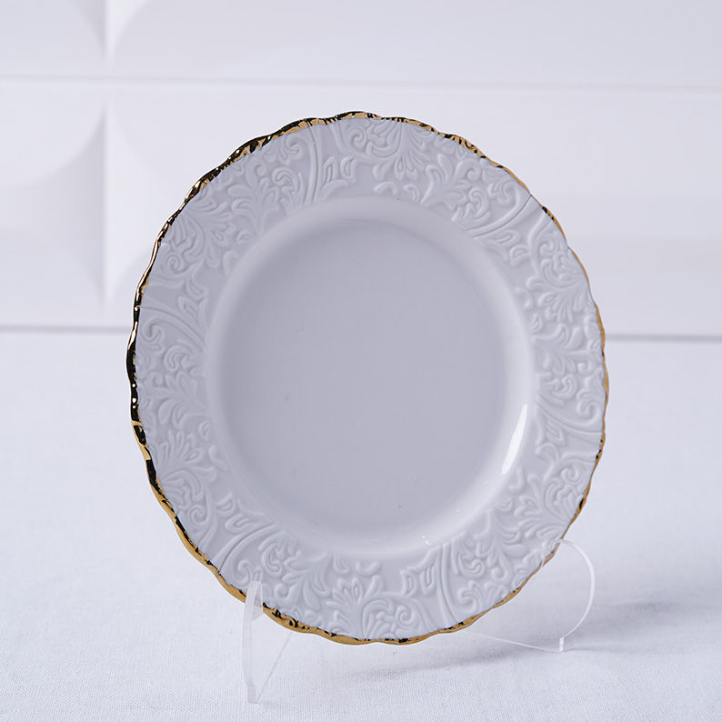 La dorure est appliquée sur la ligne de crête et le pourtour du bord ondulé, accentuant le relief et ajoutant une touche luxueuse et précieuse.