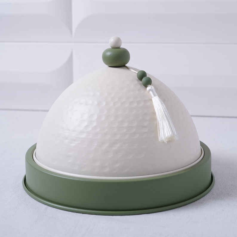 Cette cloche apporte une touche de douceur naturelle et de sérénité. Elle présente le même dôme en métal blanc cassé avec la finition martelée artisanale. La base est mise en valeur par un anneau de couleur Vert Olive mat, une teinte tendance qui évoque le calme et la nature.