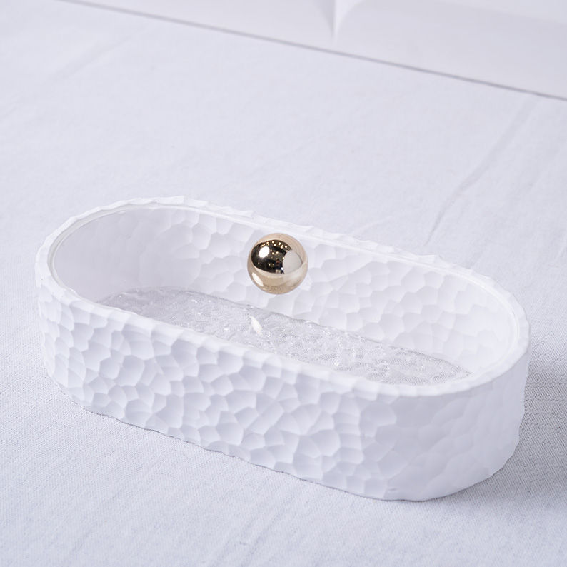 Matériaux : La base est en céramique blanche mate. La cloche (généralement fournie avec le présentoir) est en plexiglas ou en verre transparent.