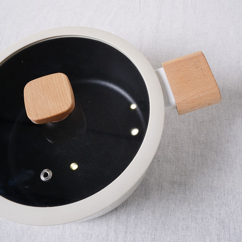 Couvercle : Verre transparent avec un bouton en bois clair assorti.