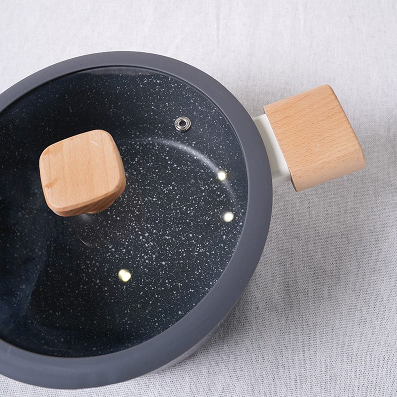 Poignées : Il est équipé de deux anses courtes de chaque côté, faites de bois clair.