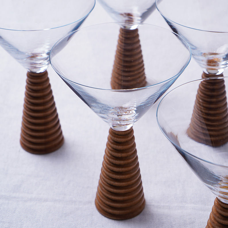 Design Sculptural : Chaque coupe repose sur un pied conique composé d'une succession d'anneaux horizontaux superposés, créant un effet de spirale ou de "ruche" très graphique.