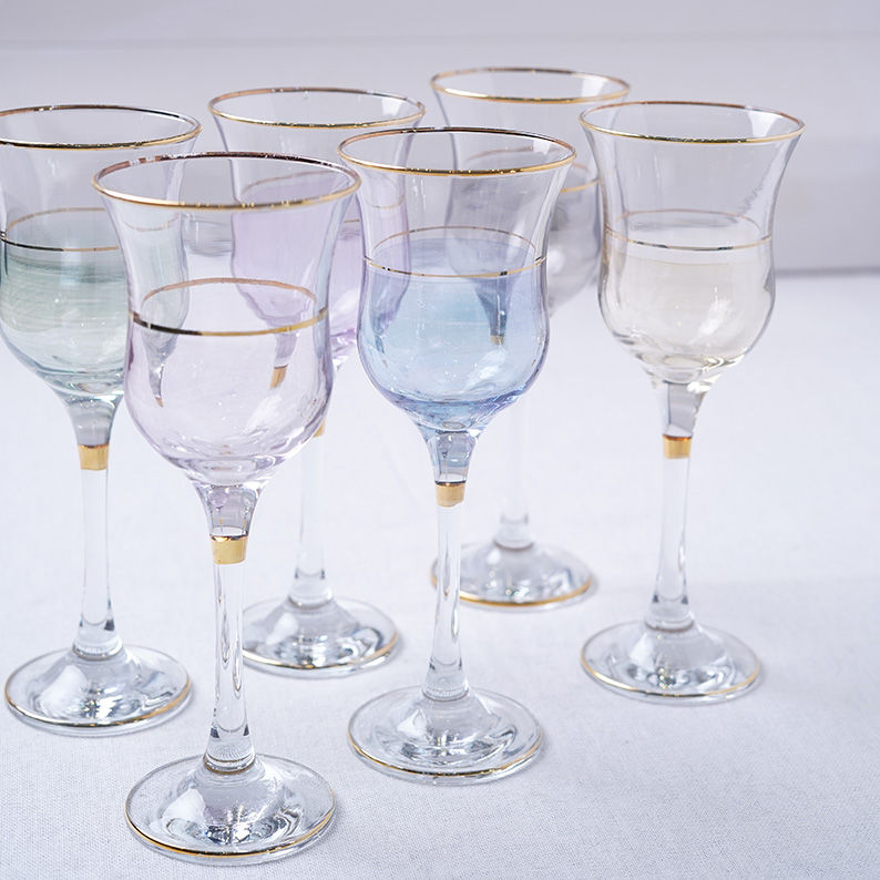 Ce lot est composé de six verres à pied élégants et minces, qui combinent une forme classique avec une touche de couleur moderne et un raffinement doré.