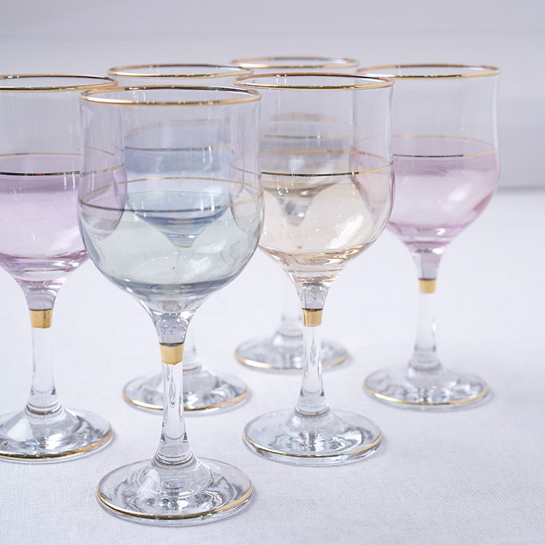 Ce lot se compose de six verres à pied qui présentent une esthétique raffinée, combinant des teintes pastel douces et des finitions dorées élégantes.