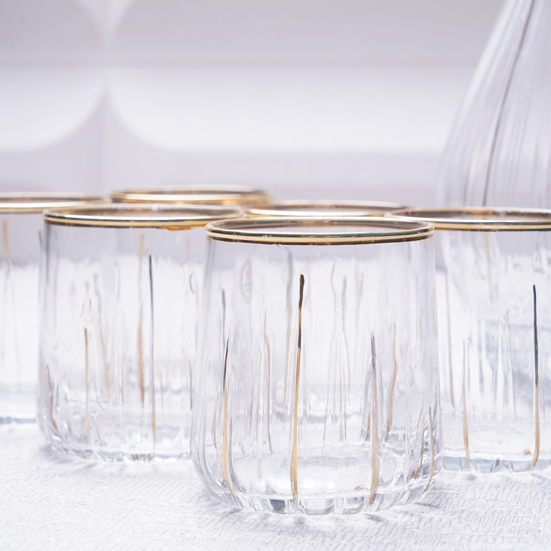 Ce coffret se compose d'une carafe (décanteur) majestueuse et de 6 verres assortis, conçus en verre cristallin de haute qualité. L'ensemble se distingue par un travail de relief vertical (côtes plates) qui joue avec la lumière, complété par des touches de dorure luxueuses.