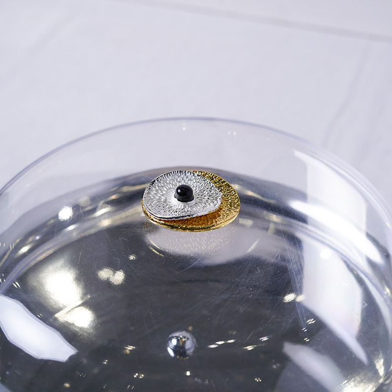 Cloche et Ornement : Le couvercle transparent (cloche) protège les aliments. Il est surmonté d'une bague décorative (ressemblant à une bague) ornée d'une pierre sombre et de détails dorés, servant de poignée.