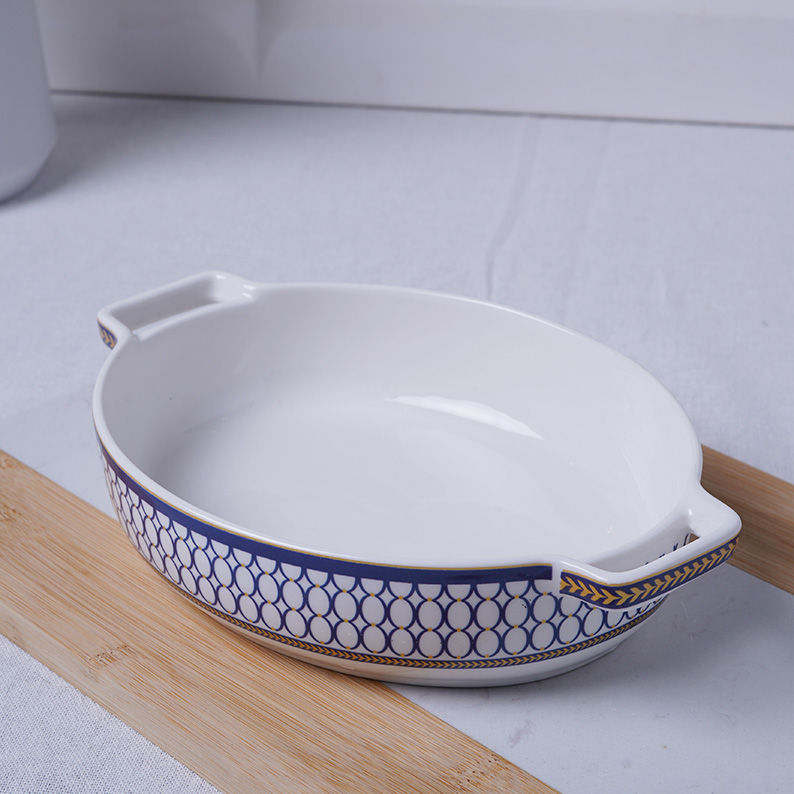 Cette pièce en céramique blanche et est ornée d'une frise graphique élégante en bleu nuit et or, avec des anses intégrées pour un service facilité.