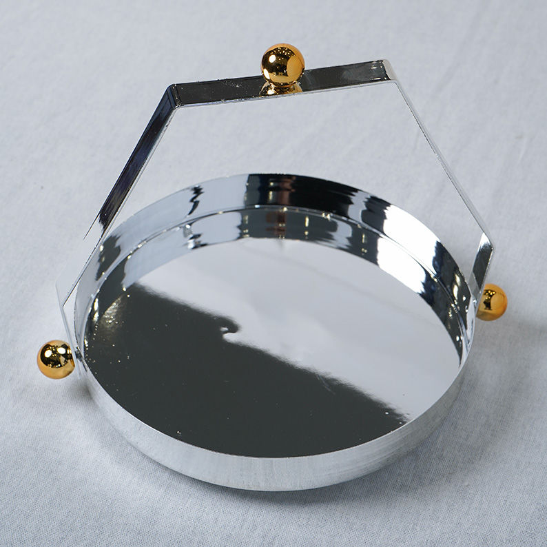 Ce plateau rond au style moderne et luxueux allie l'éclat du chrome et le raffinement de détails dorés.