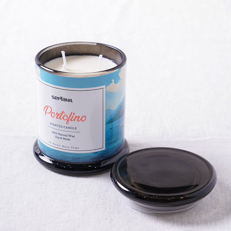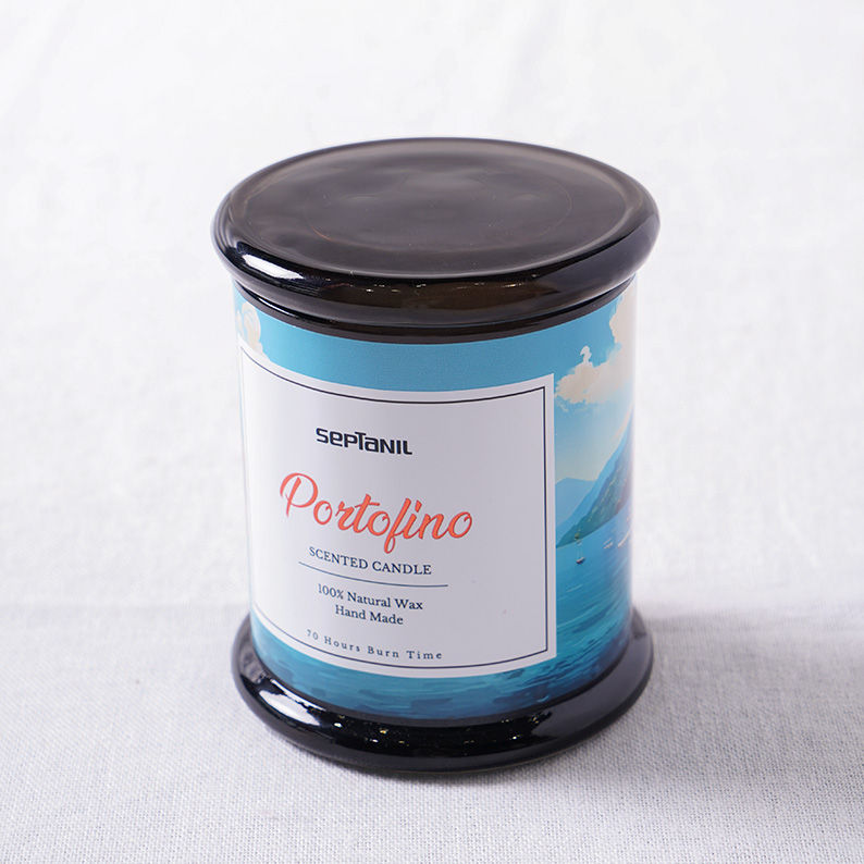 La bougie est présentée dans un élégant pot en verre teinté noir fumé, surmonté d'un couvercle assorti pour préserver le parfum lorsqu'elle n'est pas utilisée. Son étiquette artistique illustre les côtes pittoresques de Portofino, faisant de cet objet un véritable élément de décoration raffiné pour votre salon ou votre chambre.