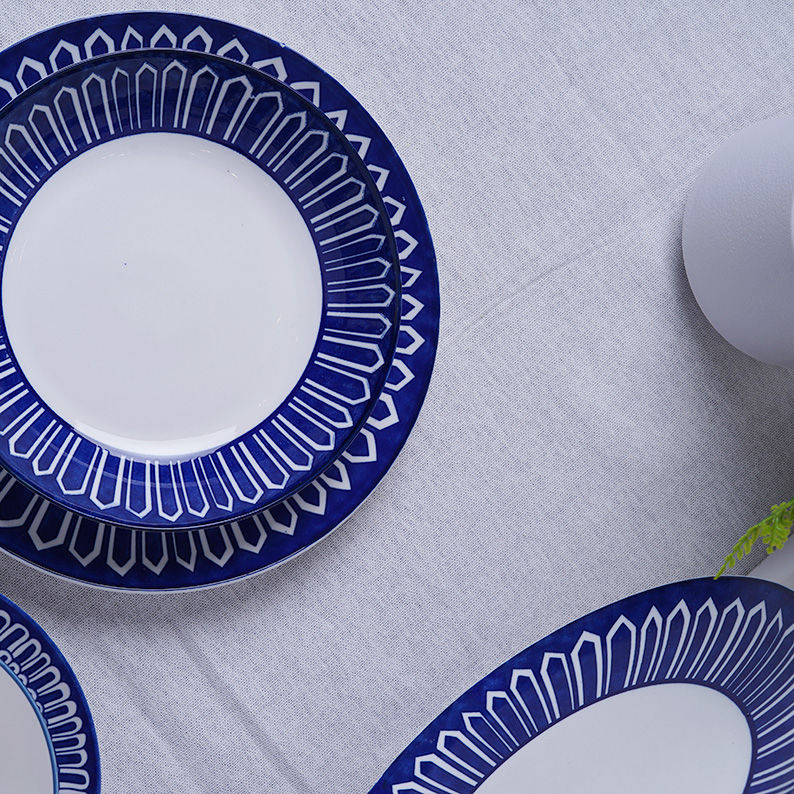Ce service de table pour 6 personnes se distingue par son élégant contraste bleu cobalt et blanc. Conçu en céramique brillante, il arbore des motifs géométriques raffinés (pointes et arcades) de style moderne.