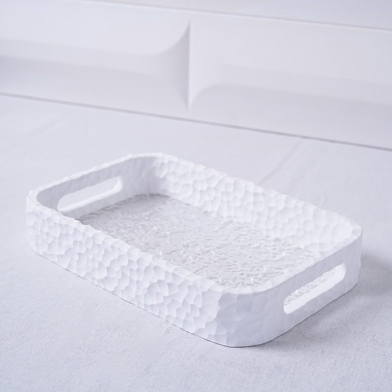 Matériaux : Le cadre extérieur épais est en céramique blanche mate. L'intérieur est une plaque de plexiglas ou verre transparent texturé (effet bullé ou martelé).