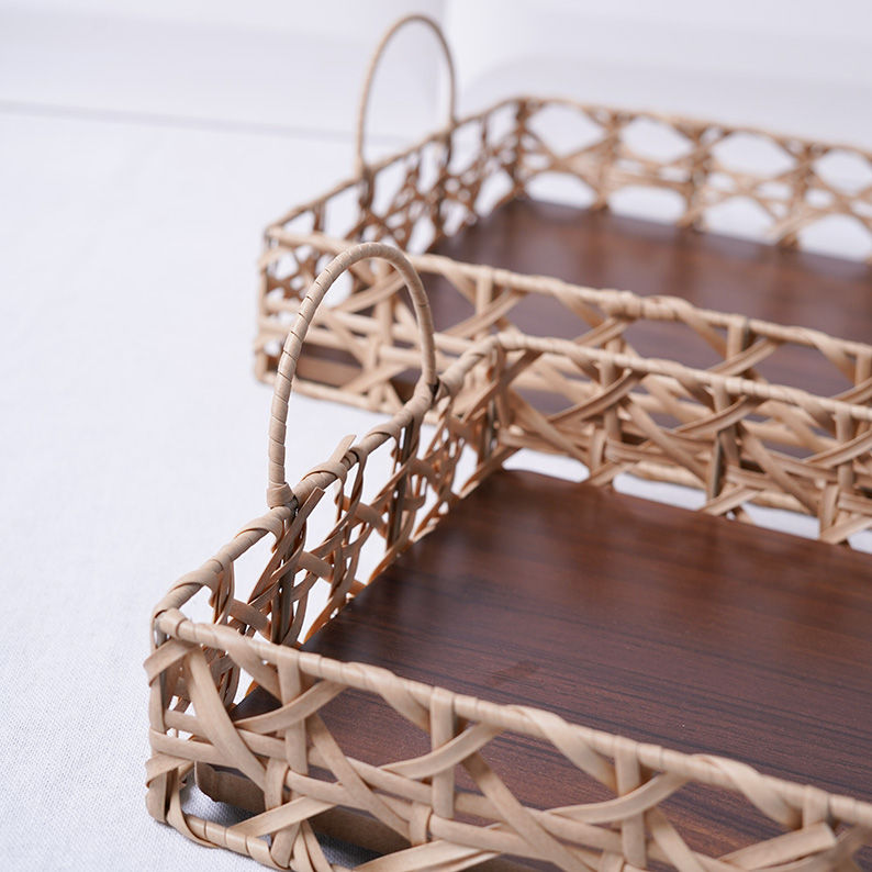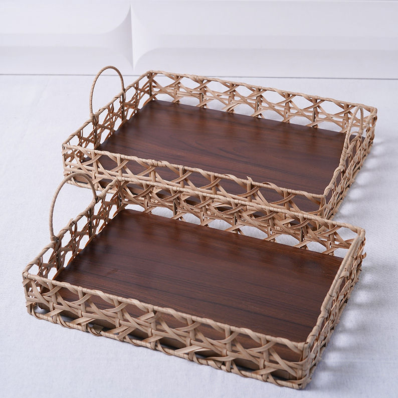 Ils sont fabriqués avec une base en bois foncé contrastant avec un bord tressé en osier ou rotin de couleur naturelle. Leur forme rectangulaire est particulièrement pratique pour servir des plats ou des boissons. Leur design tressé ajouré et leurs poignées intégrées les rendent à la fois fonctionnels et très décoratifs.