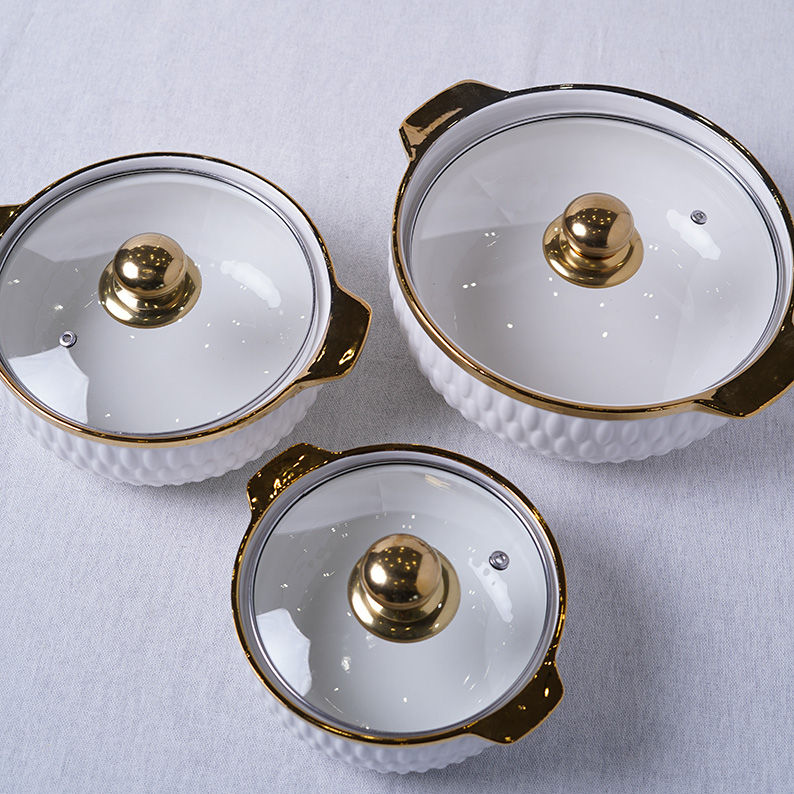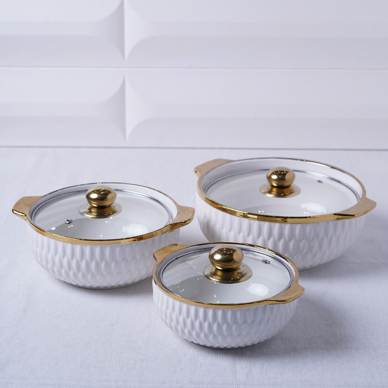 Ce set est composé de trois faitouts de tailles différentes en céramique blanche. Leur corps présente un motif extérieur en relief de type mailles tressées. L'ensemble est très luxueux grâce à des accents dorés (or) sur les boutons de couvercle, les poignées et la bordure supérieure. Les couvercles sont en verre transparent.
