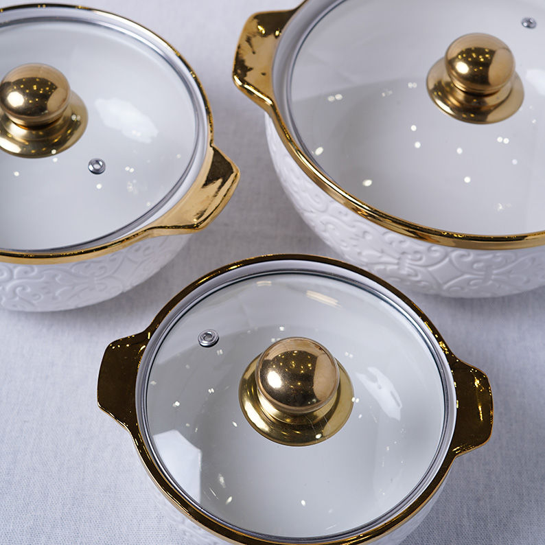 Ce set est composé de trois faitouts de service en céramique blanche. Leur corps est orné d'un motif en relief floral ou arabesque. Les couvercles en verre et toutes les bordures, poignées et boutons de préhension sont soulignés de détails dorés (or), conférant à l'ensemble un style classique et sophistiqué.