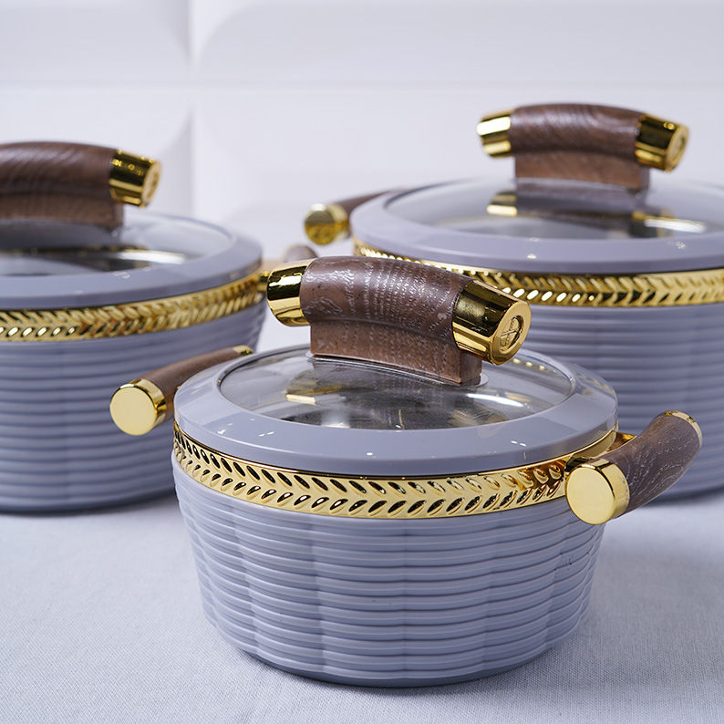 Composition : Trois récipients ronds de tailles dégressives, souvent isolés pour maintenir la température des aliments.