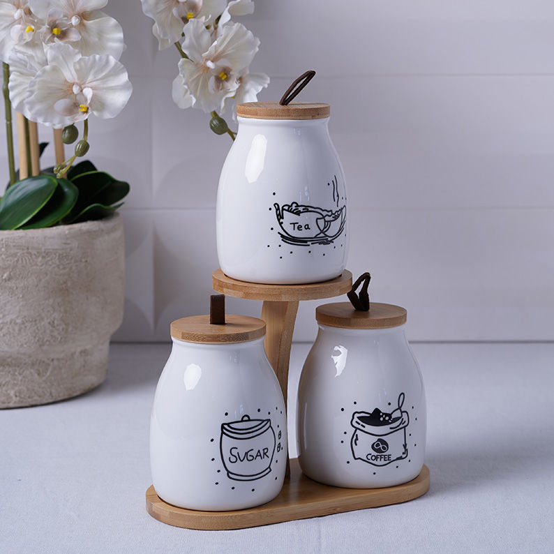 Set de 3 Boîtes à Épices en Céramique avec Support en Bois