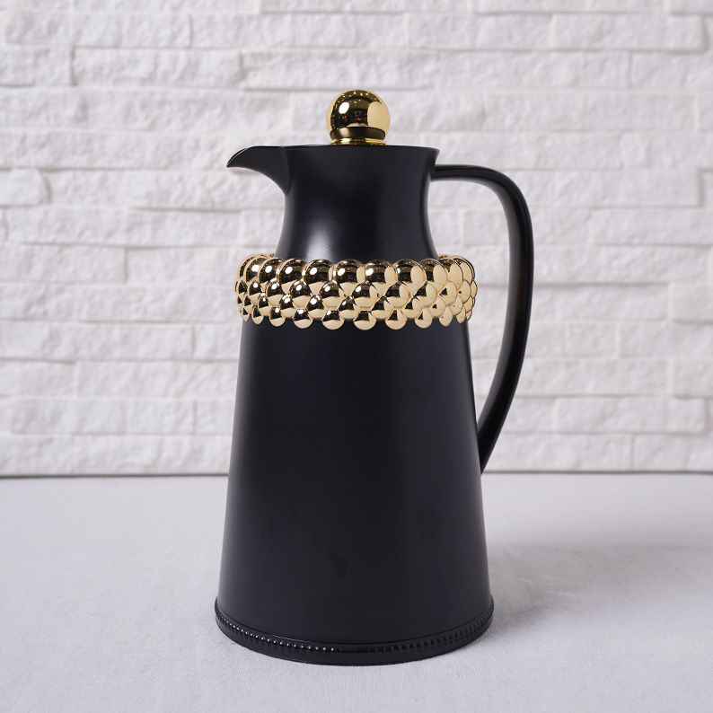 Ce thermos à café de 1 litre affiche un design luxueux et moderne. Son corps est en noir mat, contrasté par des accents dorés brillants.