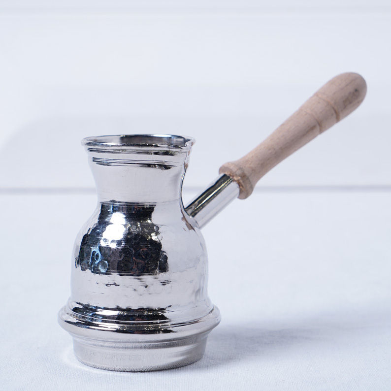 Cette Zezwa (cafetière turque) est l'ustensile indispensable pour les amateurs de café authentique. Fabriquée avec un corps en cuivre de haute qualité et revêtue d'une finition argentée brillante, elle offre une conductivité thermique exceptionnelle pour une cuisson lente et homogène du café.