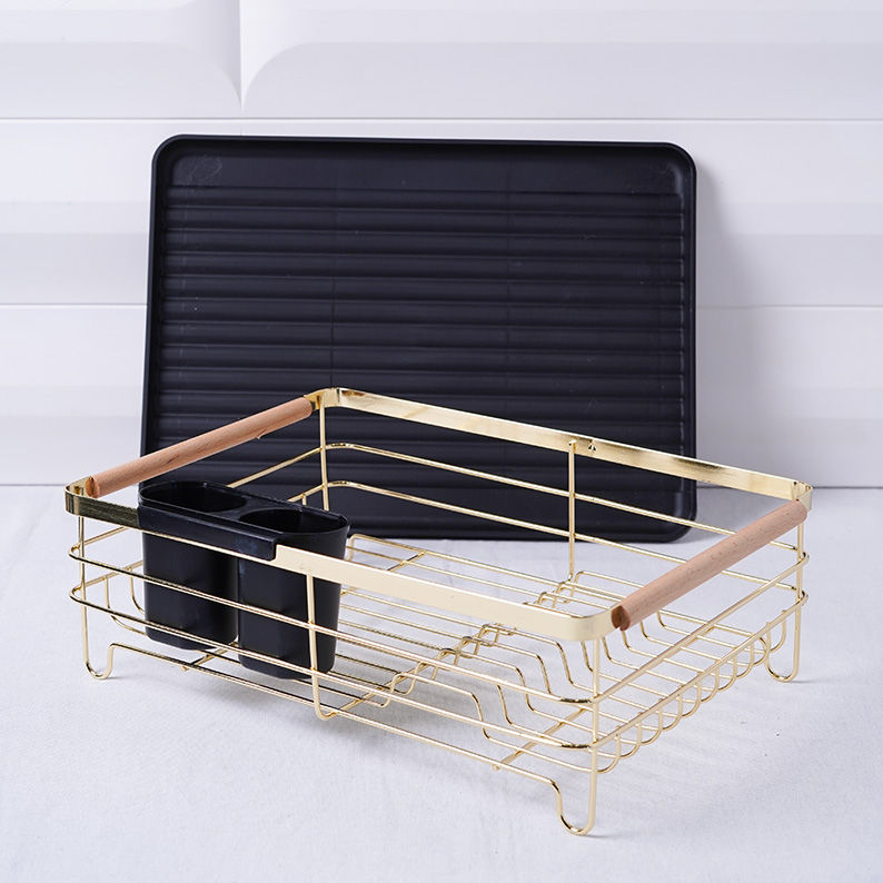 Égouttoir à Vaisselle Minimaliste – Design Or, Noir et Bois